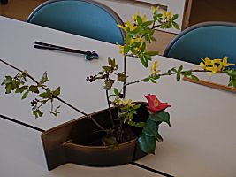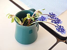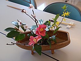春蘭、ムスカリ、椿、梅、連翹、あけびを飾りました。