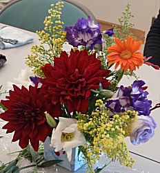 花はトルコキキョウ、ソリダコ(黄色)、ダリア、ガーベラ、モカラ(暗赤紫色の蘭)