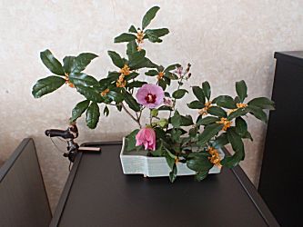 今日の花飾りは紫式部、金木犀、槿と椿の実。