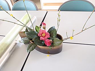 今日の花飾りは黄梅と椿です。