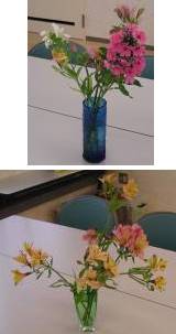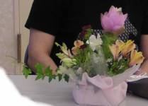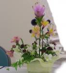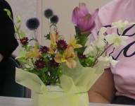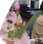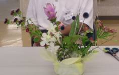 午後はフラワーアレンジメントです。ピンクの花はクルクマです。