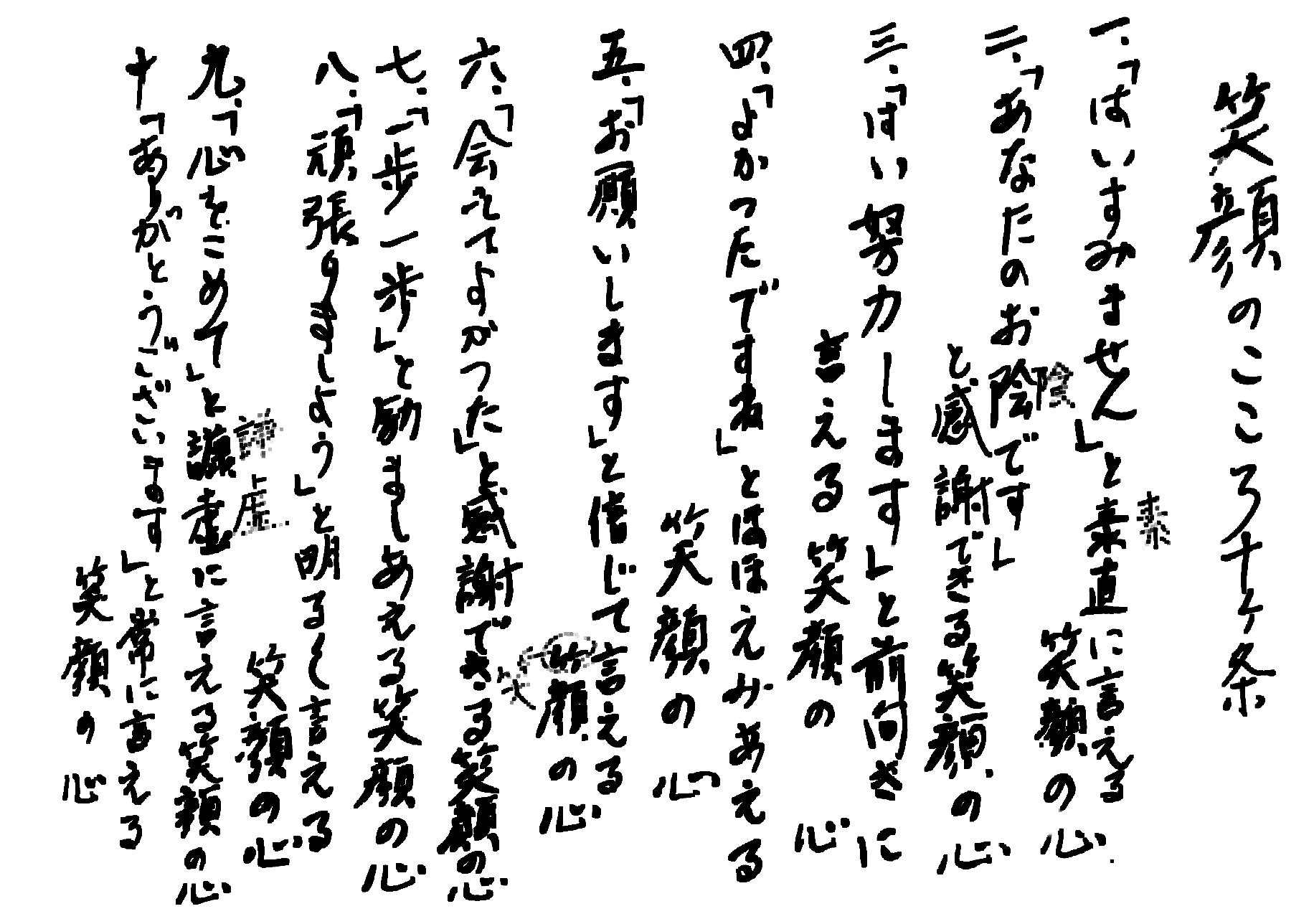 ー笑顔のこころ十か条。利用者さんが書いたものです。