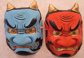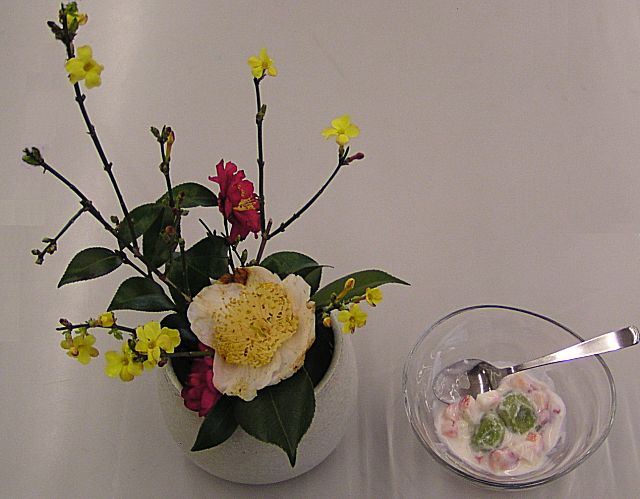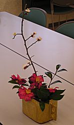 今日の花飾りは梅と山茶花。 節分のお面。
