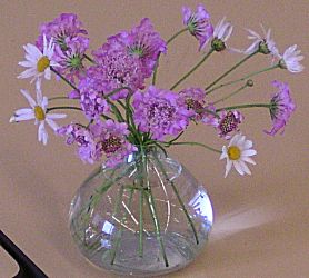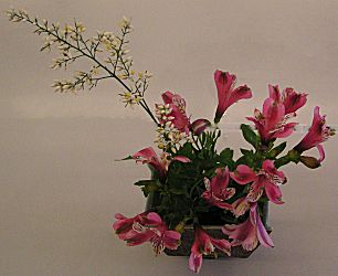 今日の花飾りはアリストロメリアと南天が一本。タイマツバナ、マツムシソウ。