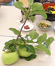 今日の花飾りは槿とモントブレチア。林檎がこんなに大きくなりました。