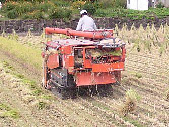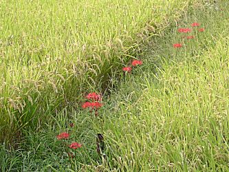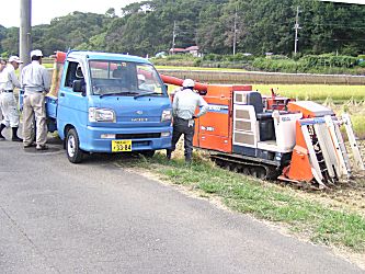 刈り取り、 トラックへの積み込み、 畦道の彼岸花