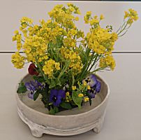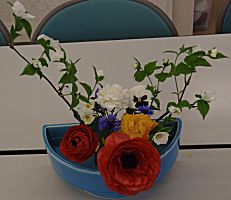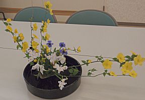 いろいろの花があります。ラナンキュラス、白山吹、矢車草、パンジー、山吹、シャガ、菜の花