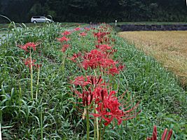 今日は雨で散歩が出来ません。でも、ふるさと村では曼殊沙華が咲き始めてきました。