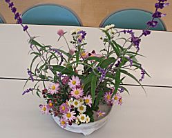 ブッシュセージ、菊、冬のクレマチスを飾りました。