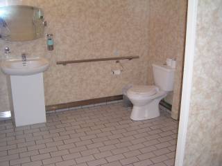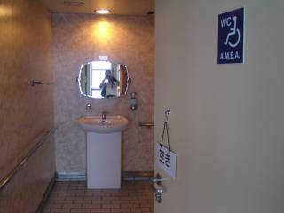 ボランティア関係は特別なことをしていませんが車椅子用のWCを覗いてみました。通常の部屋のトイレは非常に狭いものですがこのトイレはそれなりに広くなっています。入り口の段差にはスロープがあります。内部には手すりなどもあります。その他、専門家が見れば何かわかるかも知れませんが私には特別なことはわかりませんでした。車椅子用居室は現在使用している人と友達になっていないので内部がどのようになっているかわかりません。